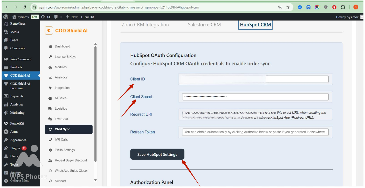 - Select CRM Sync => Hubspot settings tab.